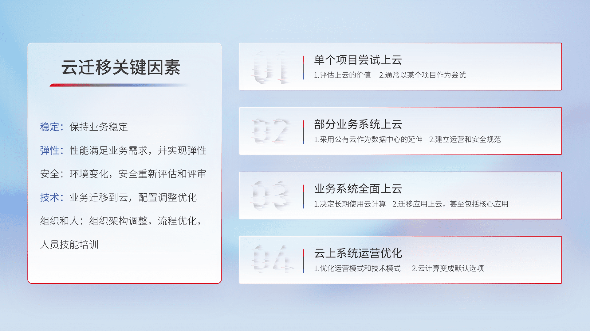 结合实际业务,,从规划设计、、云平台选型、、云原生改造、、数据迁移、、集成交付,,,,迁移全过程为客户识别最佳上云路径,,做好风险识别管理,,设计网络架构、、、身份权限、、、、安全审计合规、、、、操作审计、、日志审计、、、监控告警策略、、、多站点容灾设计等,,,对云上基础设施进行整体规划,,,提升IT治理水平,,,以满足弹性、、高可用、、高性能的需求。。。