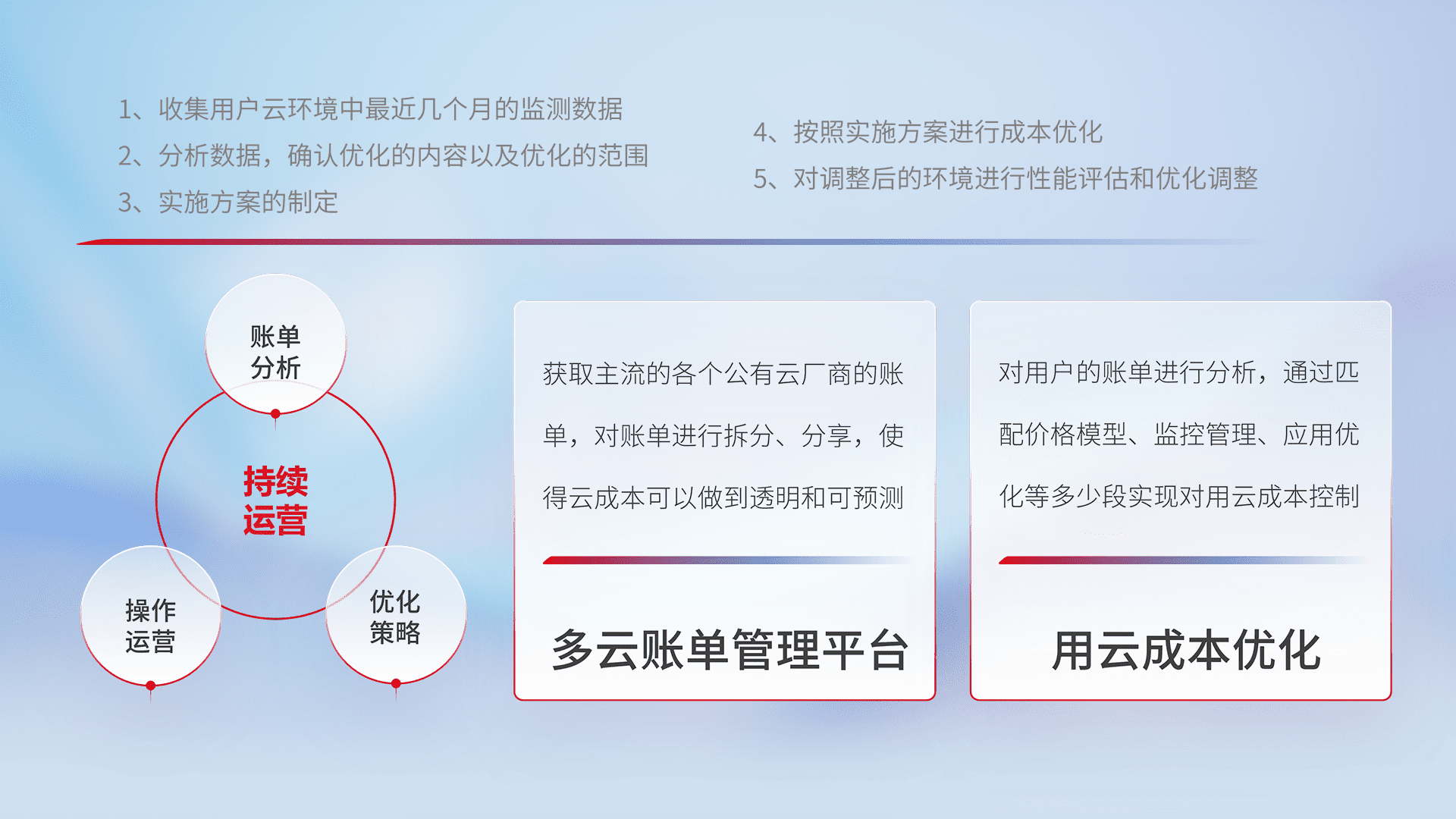 通过多云纳管,,以统一的资源数据模型把客户的云资源进行抽象和封装,,,进而实现对多云资源的统一操作,,,保障云资源管理的可靠性、、、、稳定性与可用性。。量身定制化运维内容,,配置、、、、开发运维、、补丁管理、、、备份、、、监控、、、认证和访问管理、、、、审计和日常巡检等,,,保障在用云过程中的可靠度,,,稳定度以及高可用率。。